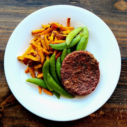 Smoked Sirloin Burger, Snap Peas & Sweet Potato Oven "Fries"
