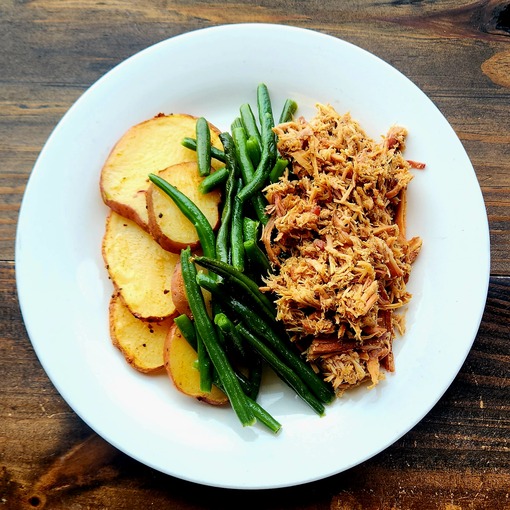 BBQ Pulled Pork Loin, Roasted Green Beans & Red Potato