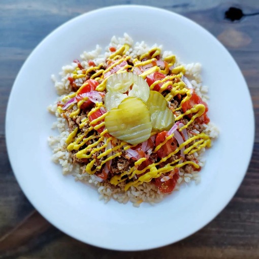 Turkey Burger Bowl - 93/7 Ground Turkey, Brown Rice, Cheese, Ketchup, Mustard, Pickle, Onion,Tomato